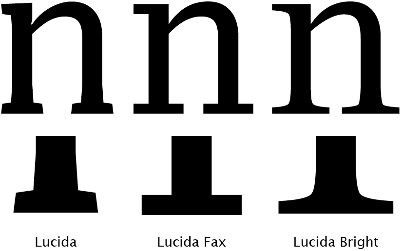 Lucidaはその後さらにファックスなど更に劣悪な解像度でも堪えるように完全なスラブセリフ化が施されたLucida Faxと、逆に高解像度化で美しく見えるように完全なブラケットセリフを与えられたLucida Brightが作られました。Brightでは線幅のコントラストがより強くなっています。OSXにはこのFaxとBrightは搭載されていますが、一番最初のLucidaは搭載されていません(技術的にも時代遅れ、ファミリー展開的にも中途半端になったからでしょう)。