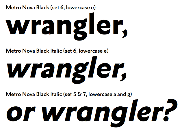 Metro Novaでのイタリックは基本的に傾斜のみですが、オルタネートの字形を使ってイタリックの見た目を自由に変えることができます。