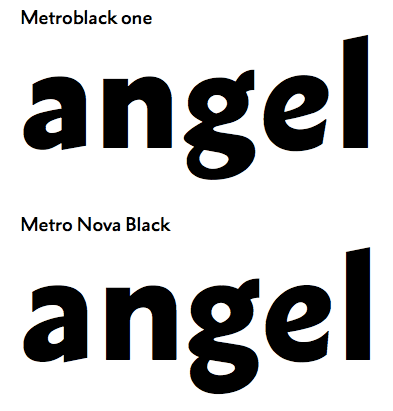上の例には映画用にデジタル化したMetroblackを使っています(元のデザインと同じです)。Novaでは元のデザインの堅苦しい部分を取り除き、極端な線幅の抑揚も減らしています。
