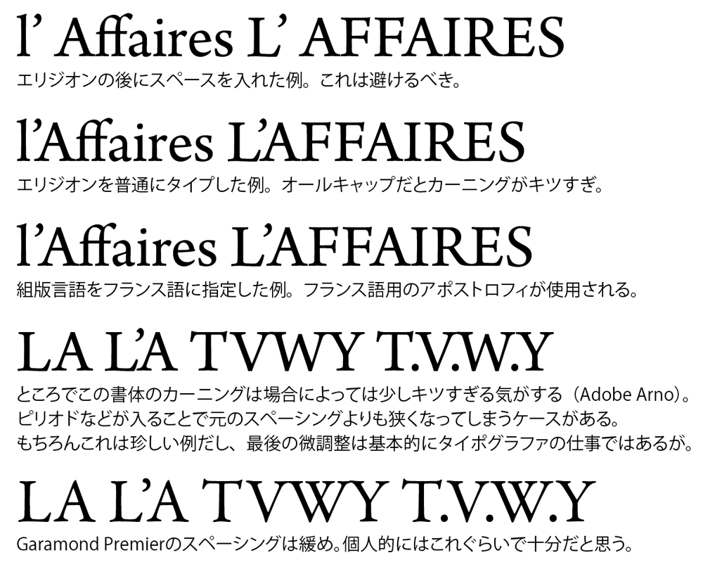 以上の二つの方法もとりあえず問題ないのですが、気になるのはなにもAだけではありません。本当ならどの文字に対しても少し緩めのスペーシングが発生するのが理想です。一体どうすればいいでしょうか?Adobeは面白い方法で実装しています。Garamond Premierにはサイドベアリングが多めに設定されたフランス語、イタリア語専用のアポストロフィのオルタネートがあるのです(InDesignなどで当該言語を指定していると自動で使われる)。ただしアポストロフィは引用符にも使われるので、そのぶんキツめにカーニングしなければいけないグリフの組み合わせはありますが、賢い方法だと思います。
